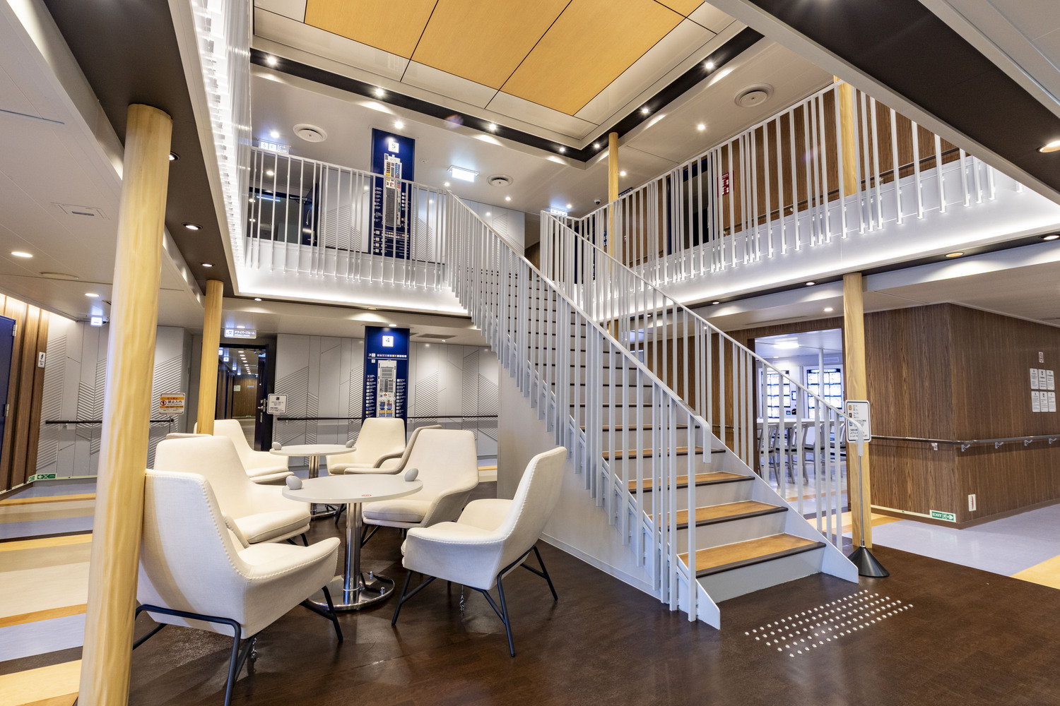Its flagship large ferries (Blue Series) offer high stability with minimal sway, featuring sophisticated, hotel-like spaces throughout the ship.